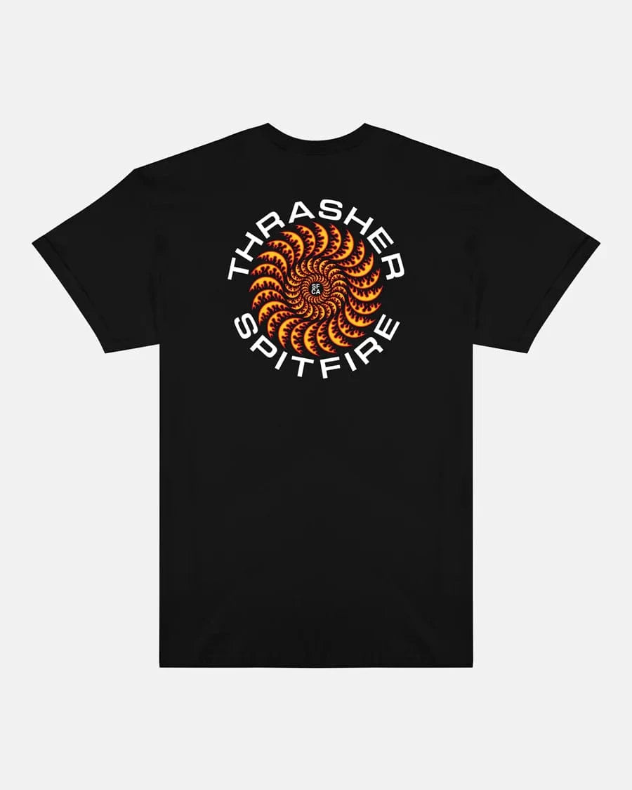 Standard fit T-shirt woven from cotton, finished with Thrasher x Spitfire artwork at left-chest, large print on back, and sewn-in label at inner neck.