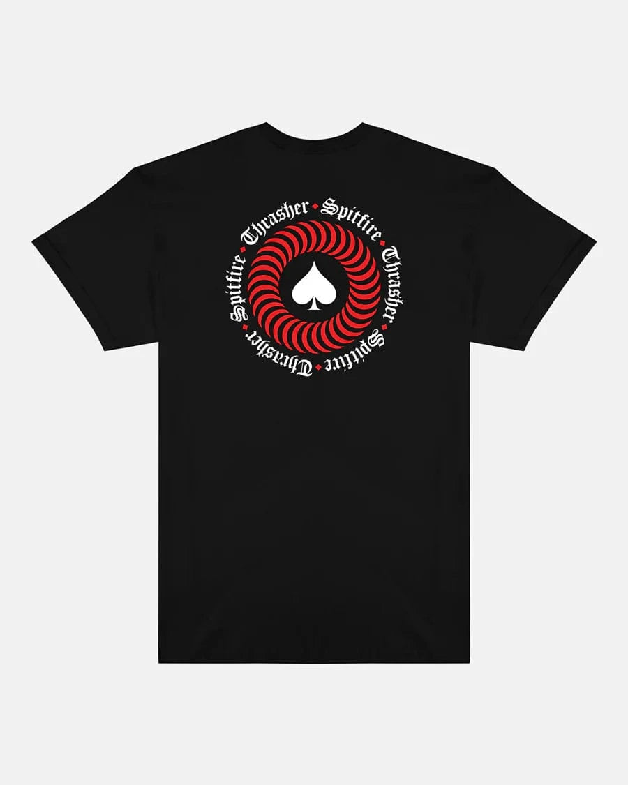 Standard fit T-shirt woven from cotton, finished with Thrasher x Spitfire artwork at center-chest, large print on back, and sewn-in label at inner neck.