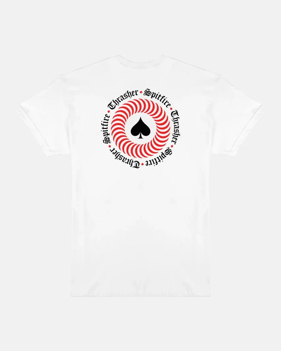 Standard fit T-shirt woven from cotton, finished with Thrasher x Spitfire artwork at center-chest, large print on back, and sewn-in label at inner neck.