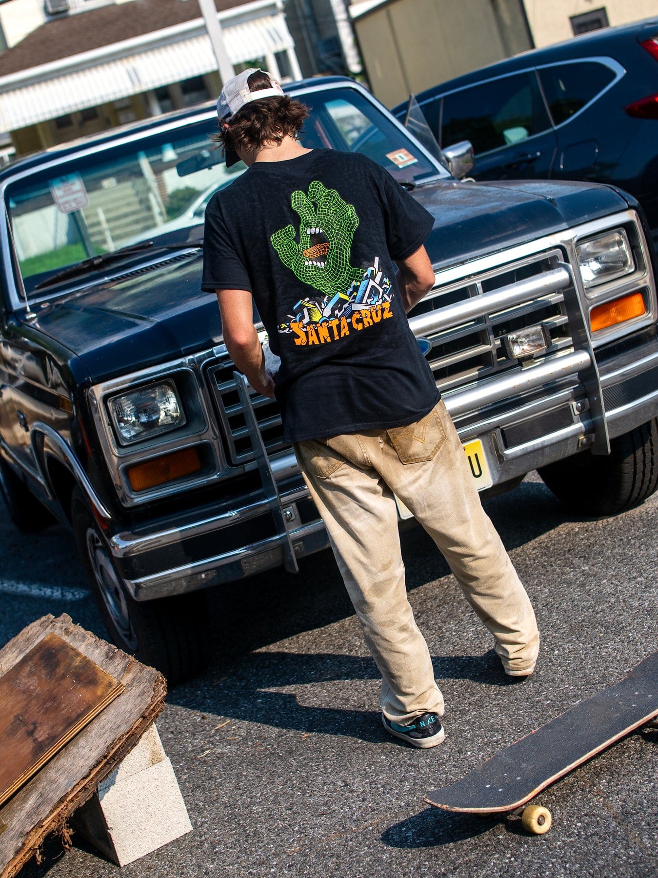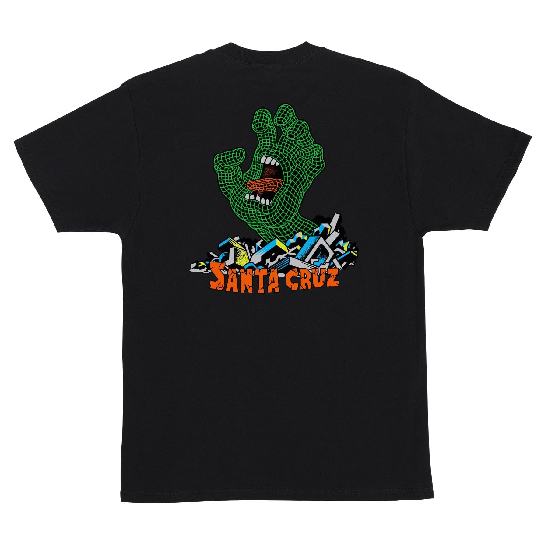 The Santa Cruz Kendall Grid Hand men's regular fit short-sleeve t-shirt features small front and large back Santa Cruz Kendall Grid Hand artwork printed in soft hand ink