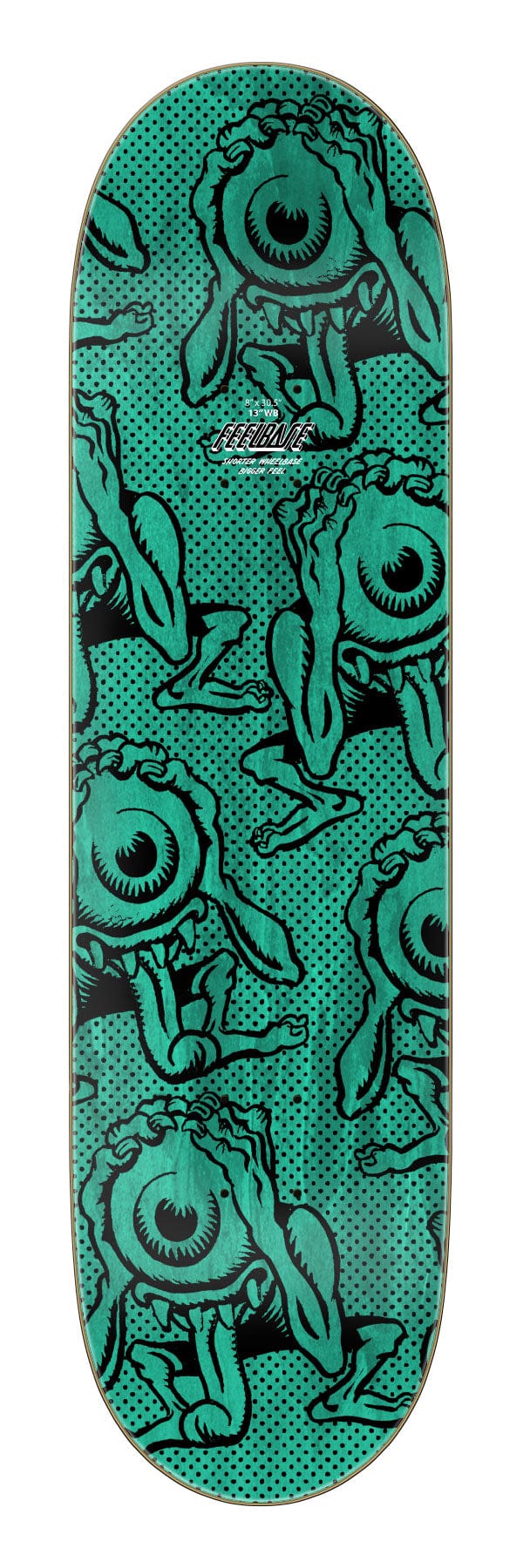 TheĀ Santa Cruz Skateboards Eyegore PrismaticĀ FeelBaseĀ deck features 13" wheelbase, silver rainbow prismatic foil Santa Cruz Eyegore artwork on deck bottom and all over Eyegore artwork on teal deck top.