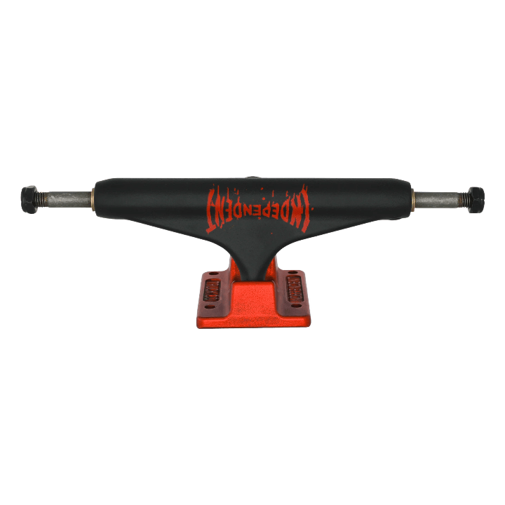 The Independent Stage 11 Splatter Span Black Ano Red trucks features flat black hanger with IndependentĀ Splatter Span logo on front, red bushings and red anodized baseplate.Ā Independent Splatter Span Apparel and Griptape Availble Holiday 2025.