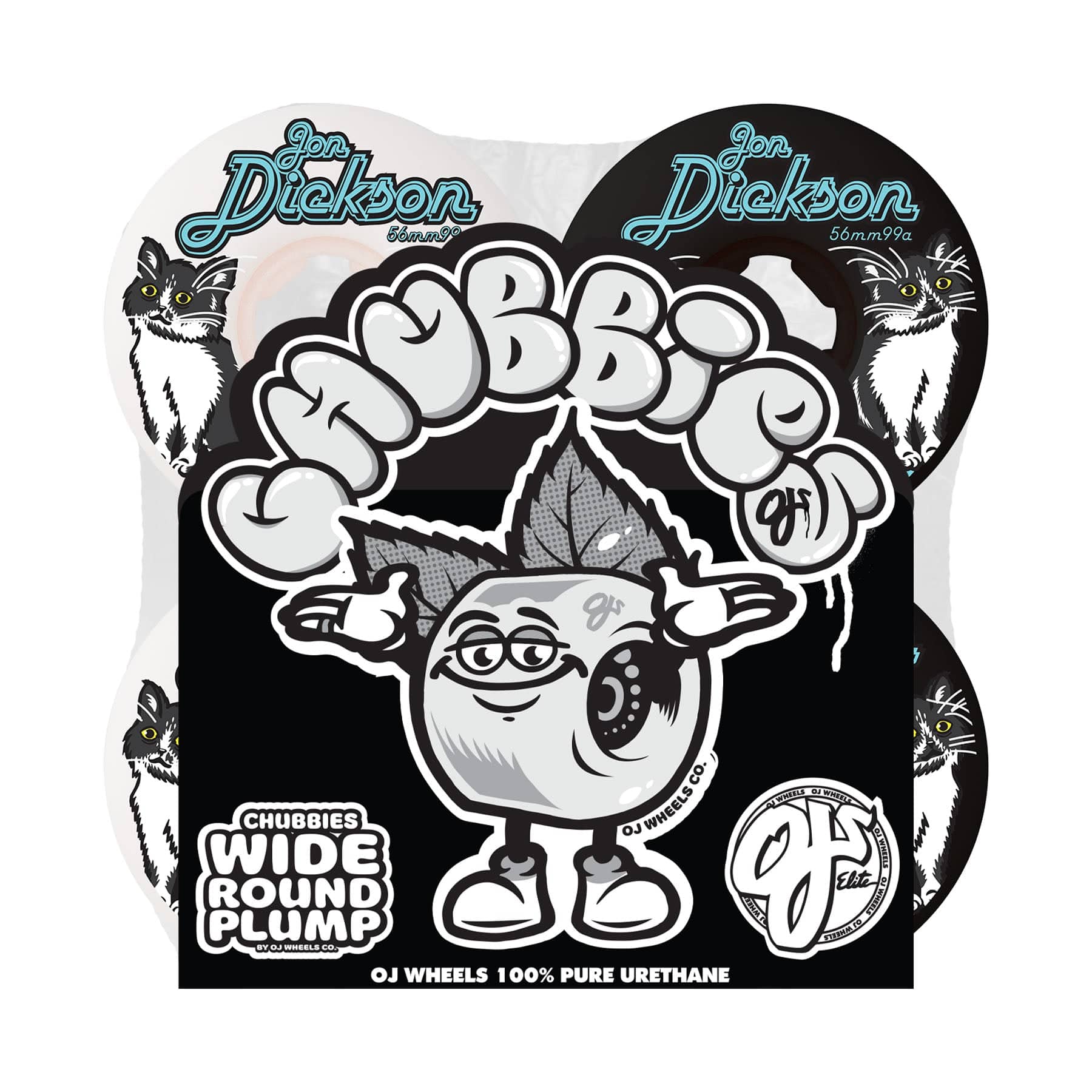 The OJ Jon Dickson Cat Chubbies 56mm, 99a White / Black WheelsĀ featureĀ OJ Jon Dickson Cat artwork, 99a OJ Elite urethane on our super wide Chubbies shape. 1 set = 2 white wheels and 2 black.