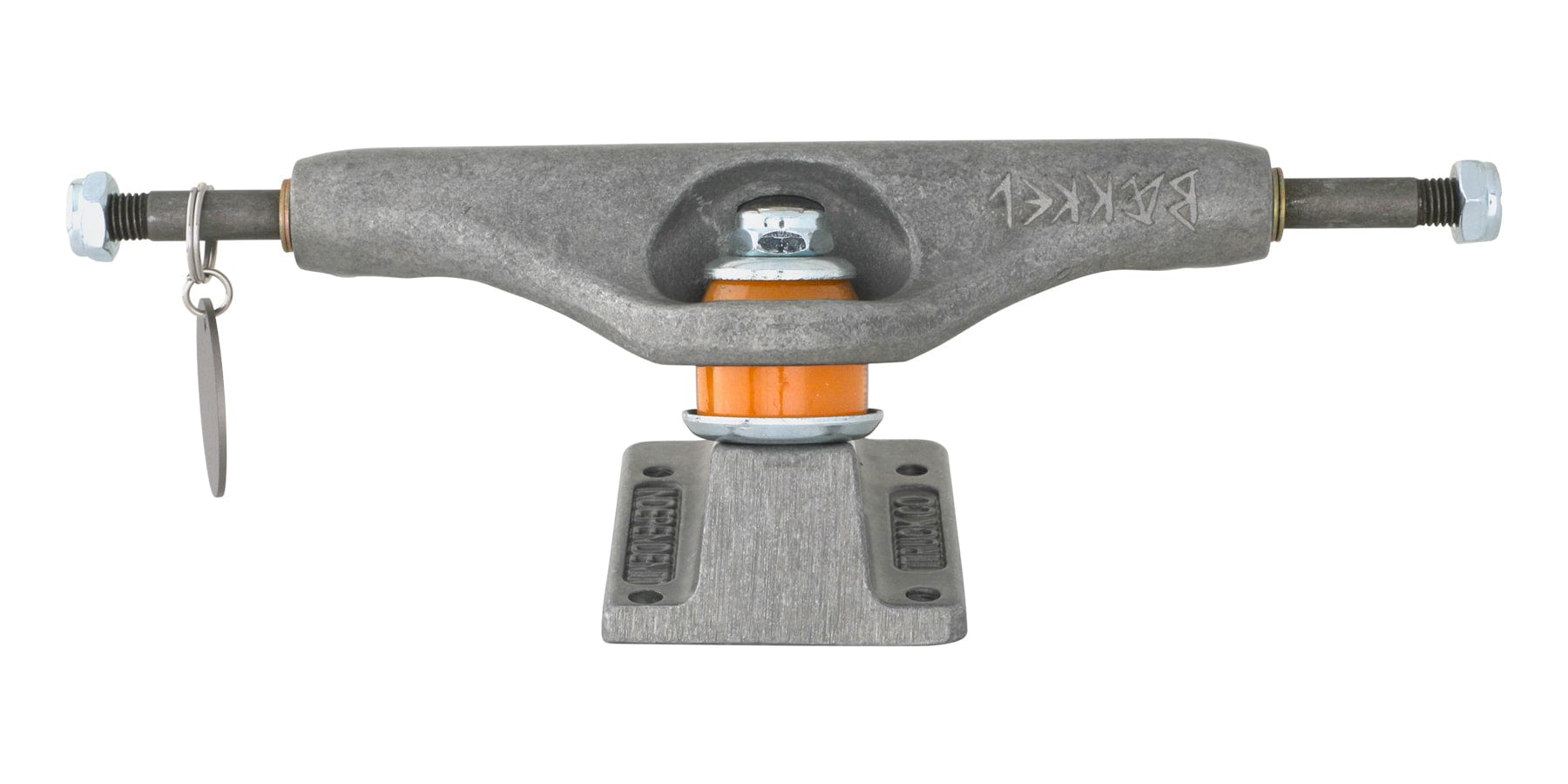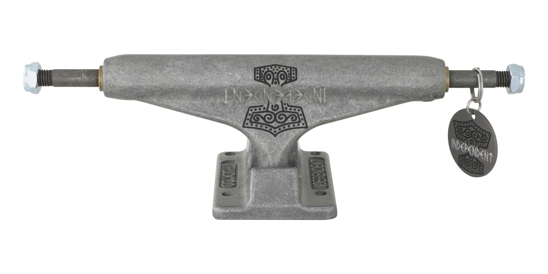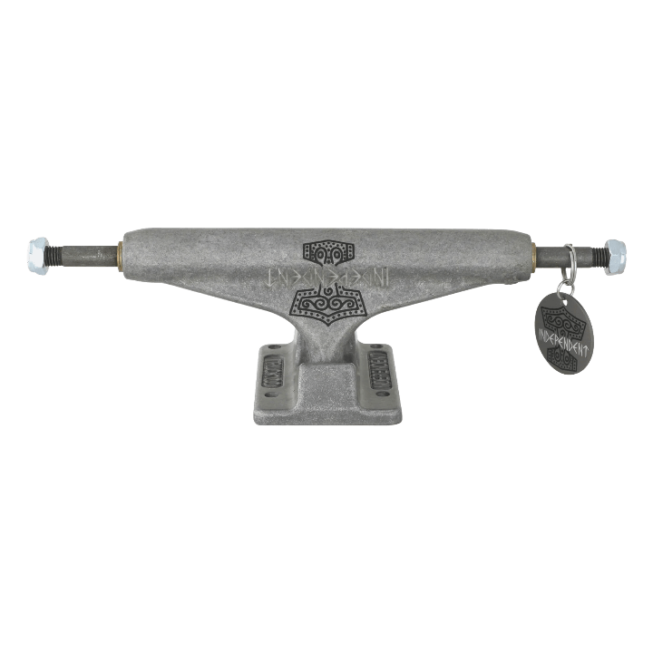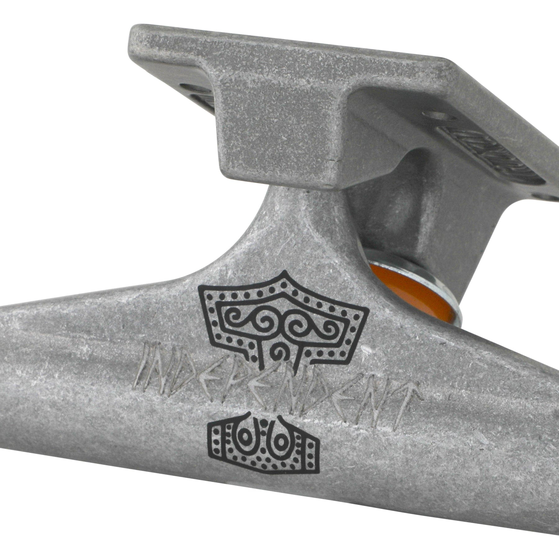 Independent Truck Company Kevin Baekkel Pro Stage 11 Hollow featuring transparent black powder coated hanger and baseplate, laser etched Independent logo and printed Norweigian mythological hammer tattoo art by Kevin's friend Hans Heggum with matching metal keychain hangtag, lasered Baekkel logo, silver hardware, and orange cushions.