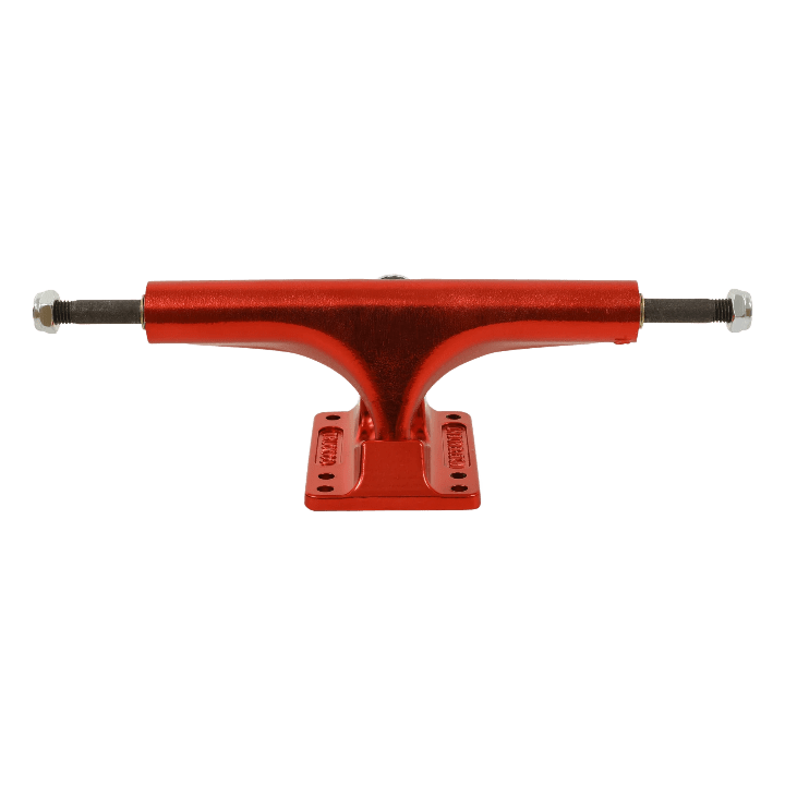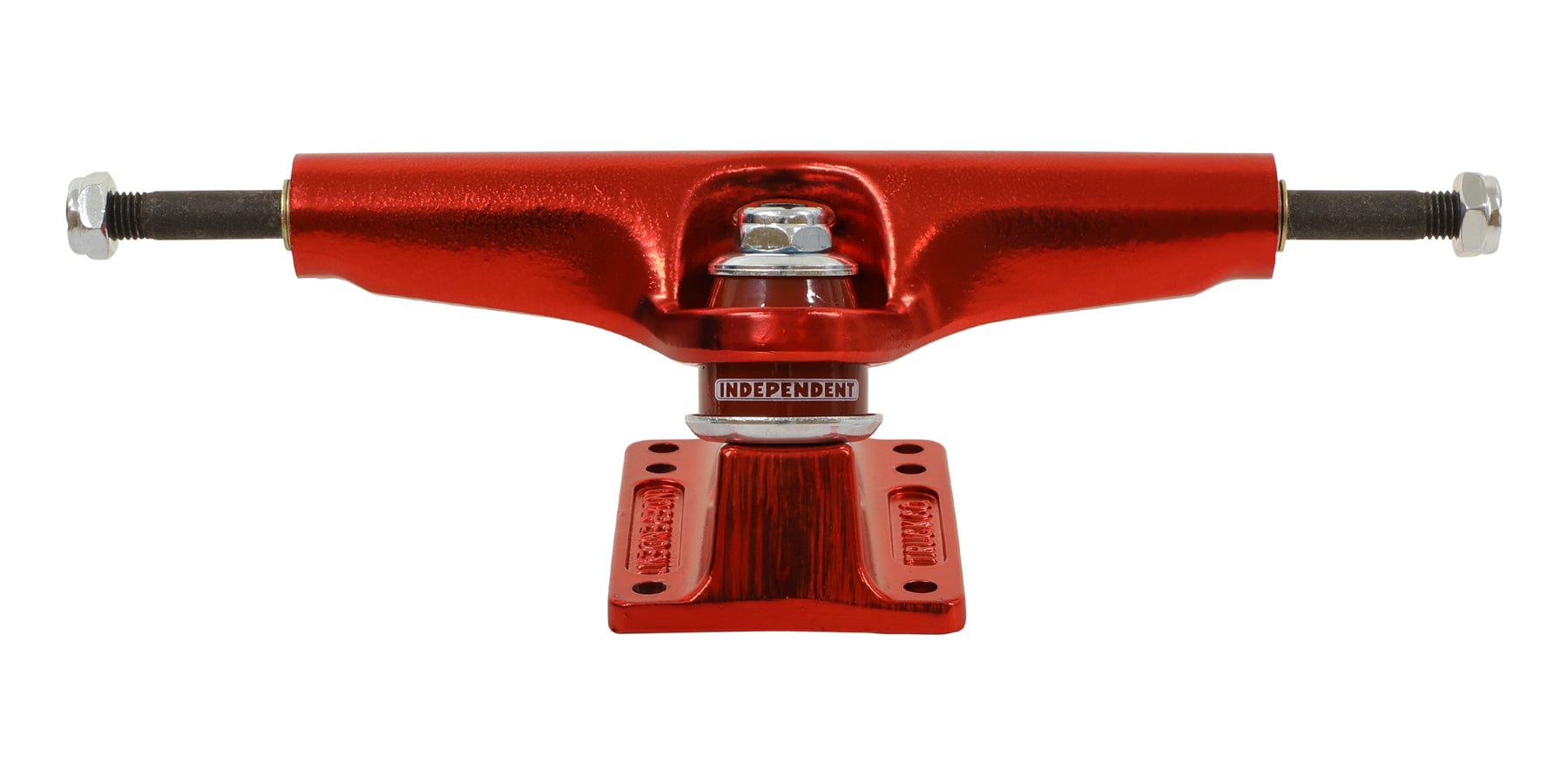 Independent Truck Company Stage 4 red featuring red powder coated hanger and baseplate, red Original Cushions, and silver hardware.Ā